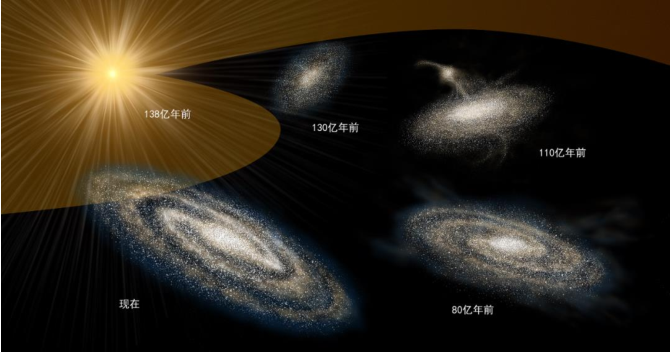 - t~30亿年,星系和大尺度结构基本形成,宇宙在宏观上由辐射期的总体均匀转变为大物质团块的宏观结构