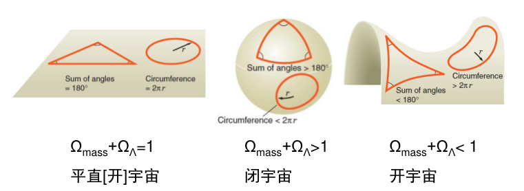 - Ω0 = Ωmass+ΩΛ~1.0,即今天宇宙的总密度极其接近其临界值